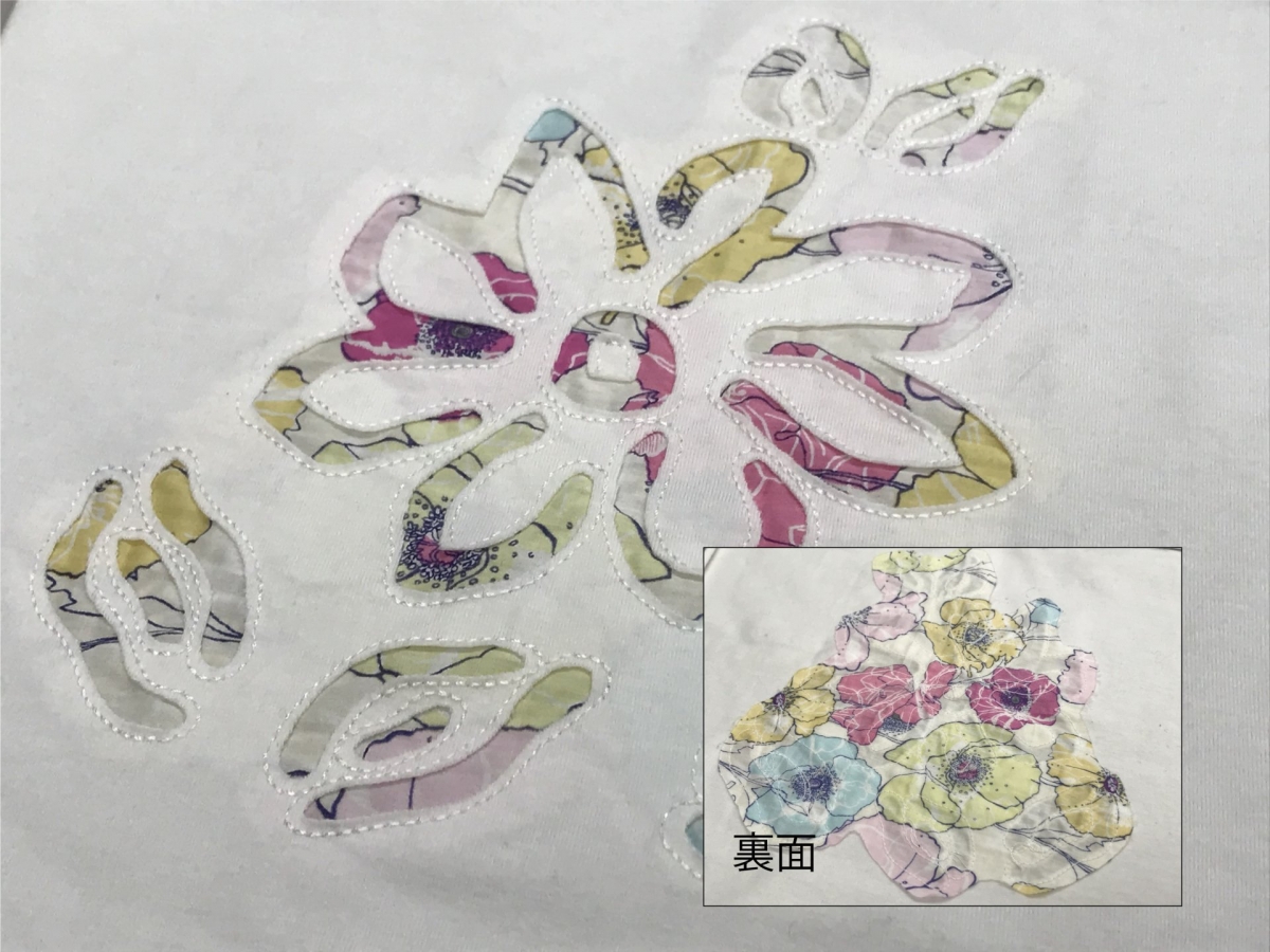 生地の裏に別生地をセットし、一緒に縫います。その後、ハンドカットにより裏の生地を表に見せています。